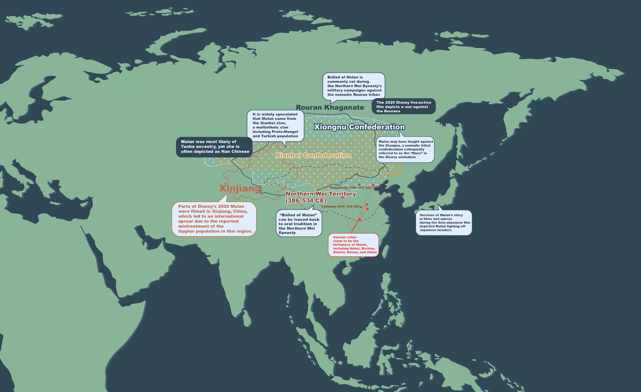 Explore the rich cultural landscape of 5th-6th century Asia, where the beloved tale of Mulan emerged during the Northern Wei Dynasty. This map reveals the fascinating intersection of peoples and powers of the time – from the Northern Wei Territory to the Xianbei Confederation and the Rouran Khaganate. While Mulan’s exact birthplace remains debated among several cities, her story flourished in a dynamic region where diverse communities, including Proto-Mongol and Turkic peoples, lived and interacted. The legend, first captured in the “Ballad of Mulan,” has transcended its origins to inspire adaptations across cultures and centuries, from Chinese opera to Japanese war tales, and modern global retellings.